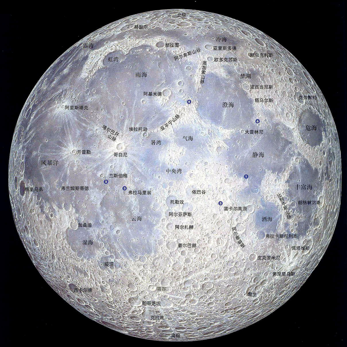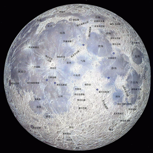 “月中人”的眼睛由“雨海”和“澄海”构成,鼻子由“暑湾”构成,嘴巴是由“云海”和“知海”构成的。这些“海”和“湾”占据了月球的六分之一,主要朝向地球。 |