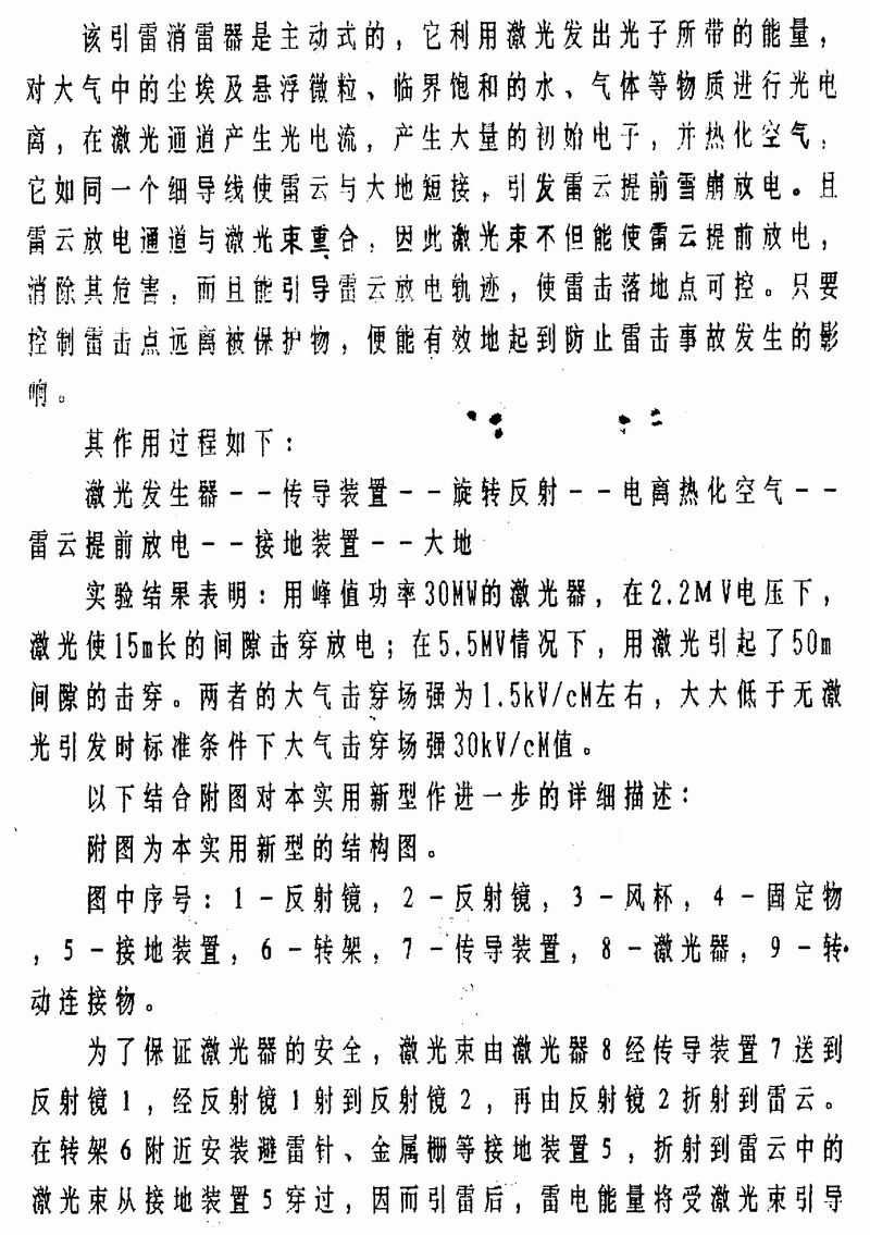 激光引雷消雷:利用高功率激光(如飞秒激光)射向带电云层,云中电荷便沿着激光产生的导电通道流向地面而释放,从而避免云中电荷过多产生雷击,目前主要用于对建筑物(如名胜古迹)提供保护。